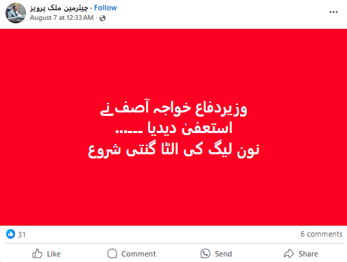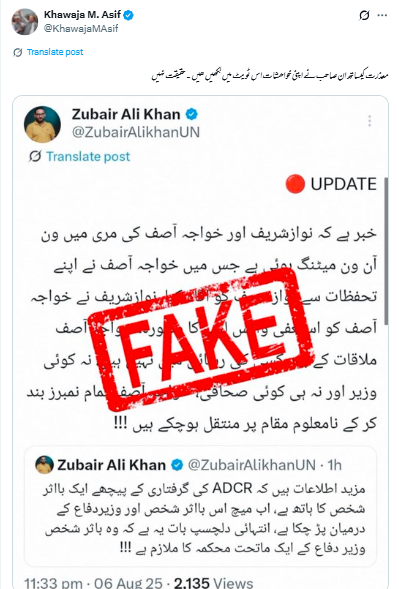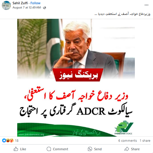 سماء ٹی وی کی ایک رپورٹ کے مطابق پاکستان کے سیالکوٹ کے اے ڈی سی آر کی گرفتاری کو لے کر پاکستانی وزیر دفاع نے شہباز حکومت سے ناراضی کا اظہار کیا تھا۔ جس کے بعد سوشل میڈیا پر گزشتہ دنوں ایک خبر گردش کرنے لگی کہ وزیر دفاع خواجہ آصف نے اپنا استعفیٰ وزیراعظم شہباز شریف کو بھجوا دیا ہے۔ ایکس پوسٹ میں ایک صارف نے لکھا “وزیردفاع خواجہ آصف نے استعفیٰ دیدیا “۔