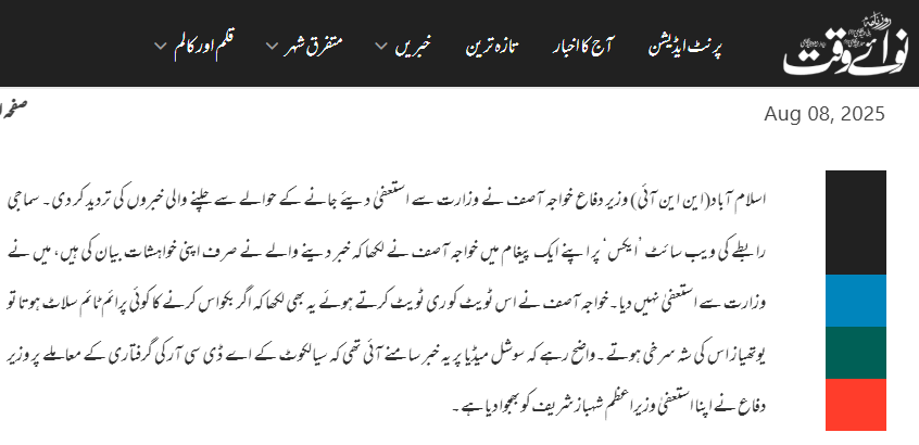 ہم نے سب سے پہلے گوگل پر “خواجہ آصف استعفیٰ” کیورڈ تلاش کیا۔ اس دوران ہمیں رواں ماہ کی 8 تاریخ کو شائع ہونے والی پاکستانی نیوز ویب سائٹس روزنامہ جنگ اور نوائے وقت پر وائرل دعوے سے متعلق خبریں موصول ہوئیں۔ ان رپورٹس کے مطابق پاکستانی وزیر دفاع خواجہ آصف نے وزارت سے استعفیٰ دیئے جانے والی خبروں کی تردید کرتے ہوئے کہا ہے کہ خبر دینے والوں نے اپنی خواہشات بیان کی ہیں،‘میں نے وزارت سے استعفیٰ نہیں دیا ہے”۔