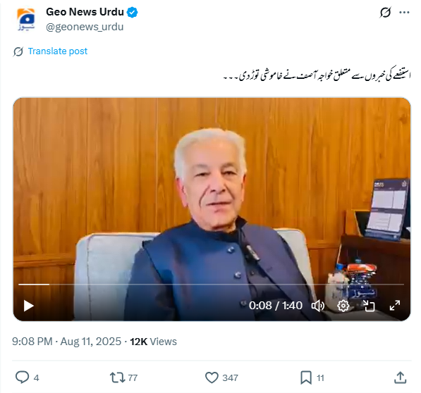 مزید تحقیقات کے دوران ہمیں جیو نیوز اردو کے آفیشل ایکس ہینڈل پر 11 اگست 2025 کو شیئر شدہ ایک ویڈیو بھی موصول ہوئی۔ جس میں بھی پاکستان کے وزیر دفاع خواجہ آصف نے استعفیٰ کی خبر کی تردید کی ہے۔