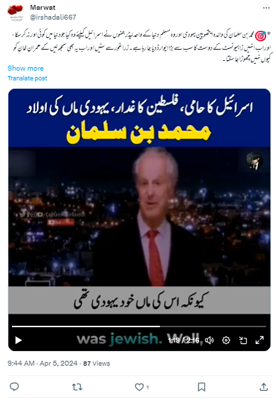 سوشل میڈیا پر ایک شخص کی تقریر کرتے ہوئے ویڈیو خوب گردش کر رہی ہے۔ جس کے اوپر لکھا ہوا ہے کہ “اسرائیل کا حامی، فلسطین کا غدار، یہودی ماں کی اولاد محمد بن سلمان اور ویڈیو کے نیچے اردو و انگریزی زبان میں سب ٹائٹل بھی موجود ہے۔