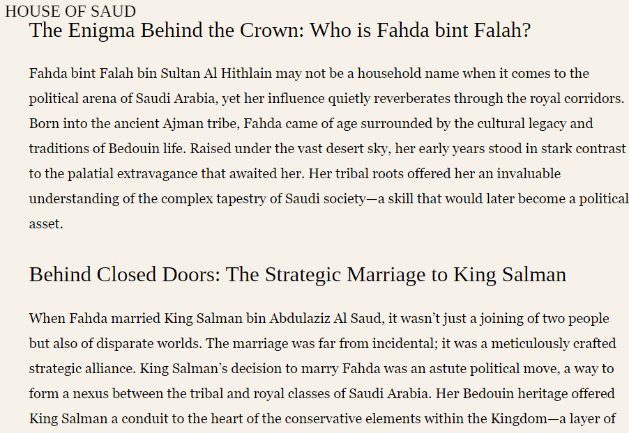 تحقیقات کو آگے بڑھاتے ہوئے ہم نے محمد بن سلمان کی والدہ کے حوالے سے کچھ کیورڈ سرچ کیا۔ اس دوران ہمیں بریٹینکا نامی ویب سائٹ پر شائع ایک آرٹیکل ملا۔ جس میں محمد بن سلمان کی والدہ کا نام فہدہ بنت فلاح ابن سلطان بتایا گیا ہے، جو کنگ سلمان کی تیسری بیوی ہیں۔