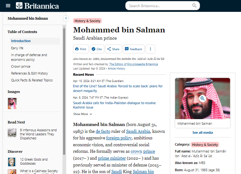 Reports published by Al Jazeera, House of Saud, NBC News and Britannica