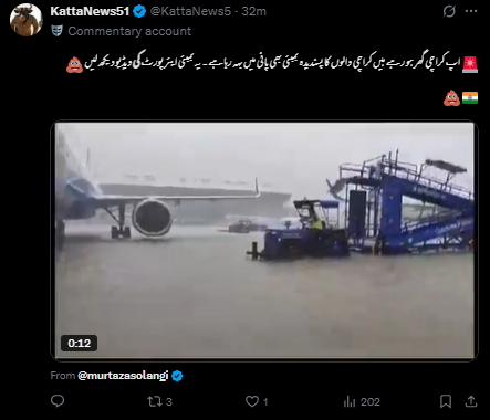 ایکس صارف نے لکھا ہے “اپ کراچی گھر ہو رہے ہیں کراچی والوں کا پسندیدہ بمبئی بھی پانی میں بہہ رہا ہے۔ یہ بمبئی ایئرپورٹ کی ویڈیو دیکھ لیں”۔