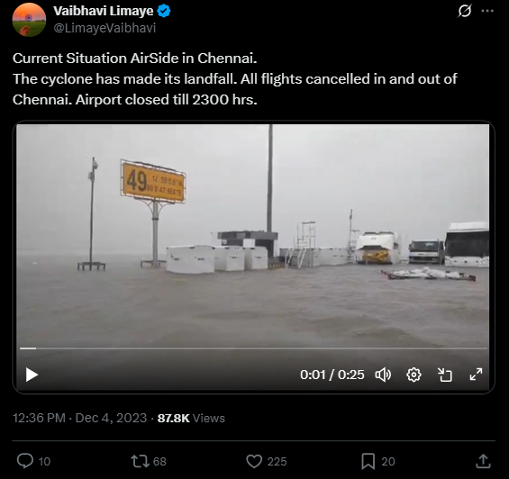 ممبئی ایئرپورٹ کے رن وے پر جمع پانی کا بتاکر شیئر کی گئی ویڈیو کے ایک فریم کو ہم نے کچھ ٹولز کی مدد سے تلاش کیا۔ اس دوران ہمیں یہی ویڈیو ویبھاوی لیمائے نامی ایکس ہینڈل پر 4 دسمبر 2023 کو شیئر شدہ موصول ہوئی۔ جس میں اس ویڈیو کو چنئی ایئر پورٹ کا بتایا گیا ہے۔
