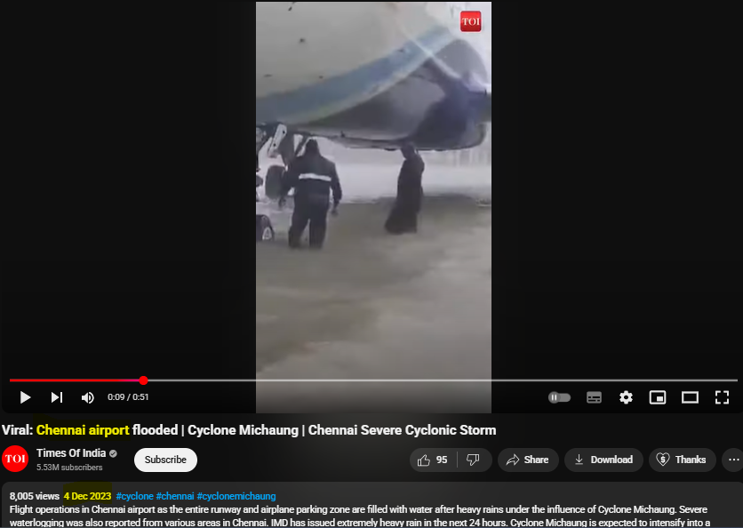 مزید تحقیقات کے دوران ہمیں وائرل ویڈیو سے متعلق آج تک اور ٹائمس آف انڈیا کی ویڈیو رپورٹس موصول ہوئیں۔ ان رپورٹس کے مطابق سائیکلون میچاؤنگ کی آمد کے ساتھ ہی چنئی اور آس پاس کے علاقوں میں شدید بارش ہوئی تھی۔ جس کے باعث چنئی ایئرپورٹ کا رن وے پانی میں ڈوب گیا، اس وجہ سے پروازیں بھی متاثر ہوئی تھیں۔ اس حوالے سے دیگر میڈیا رپورٹس یہاں اور یہاں پڑھیں۔