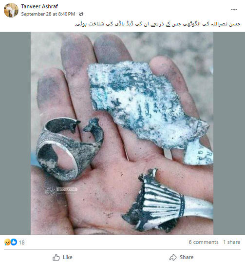 ایرانی میڈیا رپورٹ کے مطابق گزشتہ دنوں بیروت میں اسرائیلی فضائی حملے میں حزب اللہ کے سیکریٹری جنرل سید حسن نصراللہ کے ہلاک ہونے کی تصدیق کردی گئی۔ حسن نصراللہ سے منسوب کرکے ایک تباہ شدہ انگوٹھی کی تصویر شیئر کی جارہی ہے اور دعویٰ کیا جا رہا ہے کہ یہ وہی انگوٹھی کی تصویر ہے، جس کے ذریعے حسن نصراللہ کی لاش کی پہچان ہوئی ہے۔ صارفین نے تصویر کے ساتھ کیپشن میں لکھا ہے کہ “حسن نصراللہ کی انگوٹھی جس کے ذریعے ان کی ڈیڈ باڈی کی شناخت ہوئی”۔