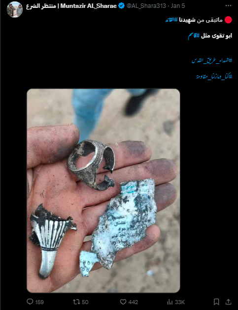 ہم نے تباہ شدہ انگوٹھی کی تصویر کو گوگل لینس پر تلاش کیا، جہاں ہمیں جنوری 2024 میں شیئر شدہ کئی عراقی ایکس صارفین کے پوسٹ ملے۔ جن میں منتظر الشرع نامی ایک صارف نے یہی تصویر عربی کیپشن کے ساتھ شیئر کی ہے۔ جس کا ترجمہ ہے “ہمارے شہید کمانڈر ابو تقوٰی کا جو باقی ہے وہ قاسم جیسا ہے”۔ ایک دوسرے ایکس صارف ‘سفيان السامرائي’ نے بھی اس تصویر کو شیئر کیا ہے۔