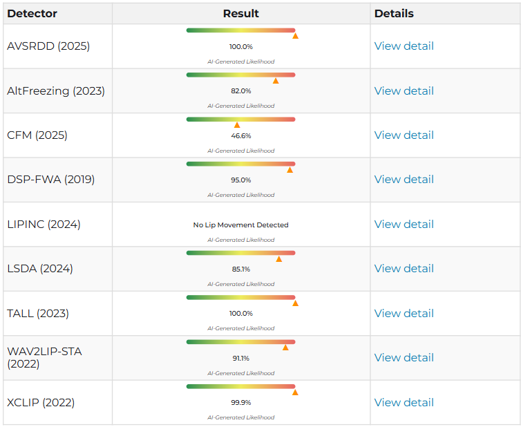 مزید تصدیق کے لئے ہم نے وائرل ویڈیو کے چند فریمز کو اے آئی شناختی ٹولز سے جانچا۔ نتائج اگرچہ کچھ مختلف تھے، تاہم ڈیپ فیک-او-میٹر کے 9 میں سے 7 ماڈلز نے تقریباً 100 فیصد امکان ظاہر کیا کہ یہ ویڈیو ڈیپ فیک ہے۔