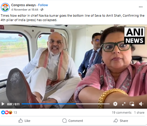 سوشل میڈیا پر ایک ویڈیو ہندی اور انگریزی متن کے ساتھ تیزی سے وائرل ہو رہی ہے، جس میں مرکزی وزیر داخلہ امت شاہ اور ٹائمز نیٹ ورک گروپ کی ایڈیٹر ان چیف نویکا کمار ایک ہیلی کاپٹر میں بیٹھے دکھائی دے رہے ہیں۔ویڈیو میں امت شاہ اپنا جوتا نویکا کمار کی طرف بڑھاتے ہیں اور نویکا کمار اسے کپڑے سے صاف کرتی نظر آ رہی ہیں۔