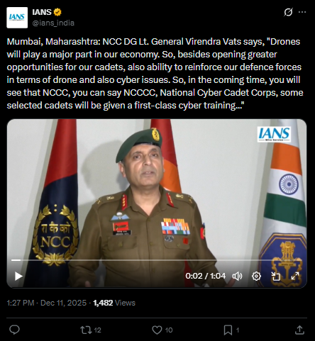 پھر ہم نے وائرل ویڈیو کے چند فریموں کو گوگل لینس کی مدد سے تلاش کیا۔ اس دوران ہمیں این سی سی کے ڈی جی لیفٹیننٹ جنرل وریندر وتس کی ہوبہو ویڈیو آئی اے این ایس نیوز کے آفیشل ایکس اکاؤنٹ پر 11 دسمبر 2025 کو شیئر شدہ موصول ہوئی۔