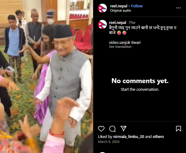 وائرل ویڈیو کے ابتدائی منظر، جس میں ایک بزرگ شخص مرد و خواتین کے ساتھ ایک کمرے میں رقص کر رہا ہے والے کیفریم کو جب ہم نے گوگل لینس کی مدد سے تلاش کیا تو ہمیں یہی ویڈیو ریل نیپال نامی انسٹاگرام پر 6 مارچ 2024 کو شیئر شدہ ملا۔