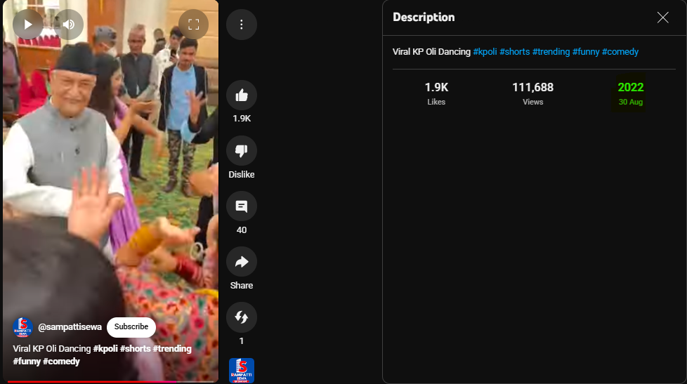 مزید سرچ کے دوران ہمیں یہی ویڈیو اگست و ستمبر 2022 کو اپلوڈ شدہ دیگر یوٹیوب چینلز پر موصول ہوئی۔ جس کے ساتھ فراہم کردہ معلومات کے مطابق اس ویڈیو کا تعلق نیپال کے کسی سیاسی ایونٹ سے نہیں بلکہ ایک عام تفریحی تقریب سے ہے جسے غلط طور پر اولی سے منسوب کیا جا رہا ہے۔ البتہ ہم آزادانہ طور پر یہ ثابت نہیں کرتے کہ یہ ویڈیو کس موقع پر فلمائی گئی اور کہاں اور کب کی ہے۔