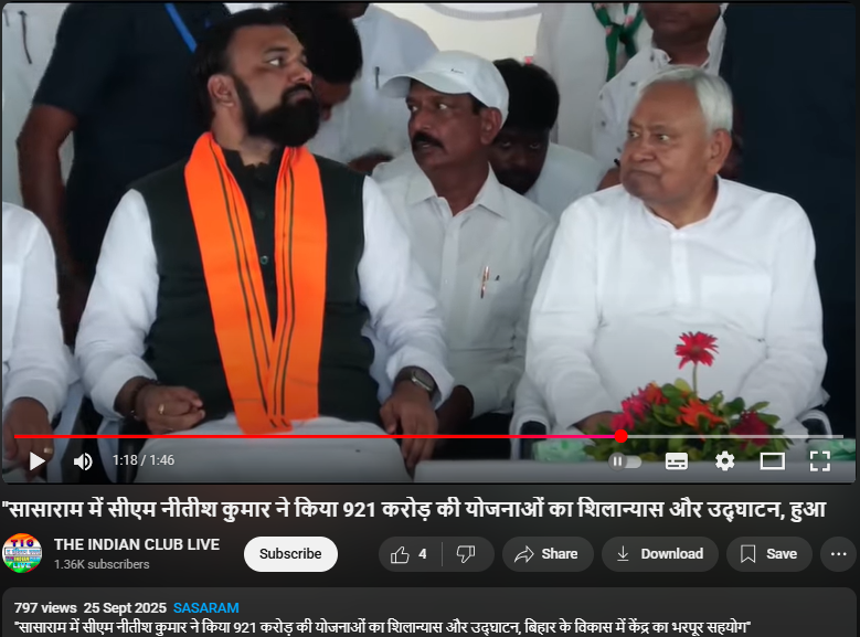 بتا دیں کہ 24 ستمبر کو نتیش کمار نے سہسارام میں این ڈی اے کارکن سمواد پروگرام میں شرکت کی تھی۔ اس موقع پر انہوں نے کئی ترقیاتی منصوبوں کا سنگ بنیاد اور افتتاح کیا۔ پروگرام میں نائب وزیر اعلیٰ سمراٹ چودھری بھی ان کے ساتھ موجود تھے۔ اس تقریب سے متعلق دینک بھاسکر، نو بھارت ٹائمز اور نیوز18 بہار جھارکھنڈ جیسے کئی معتبر میڈیا اداروں نے رپورٹیں شائع کی ہیں۔