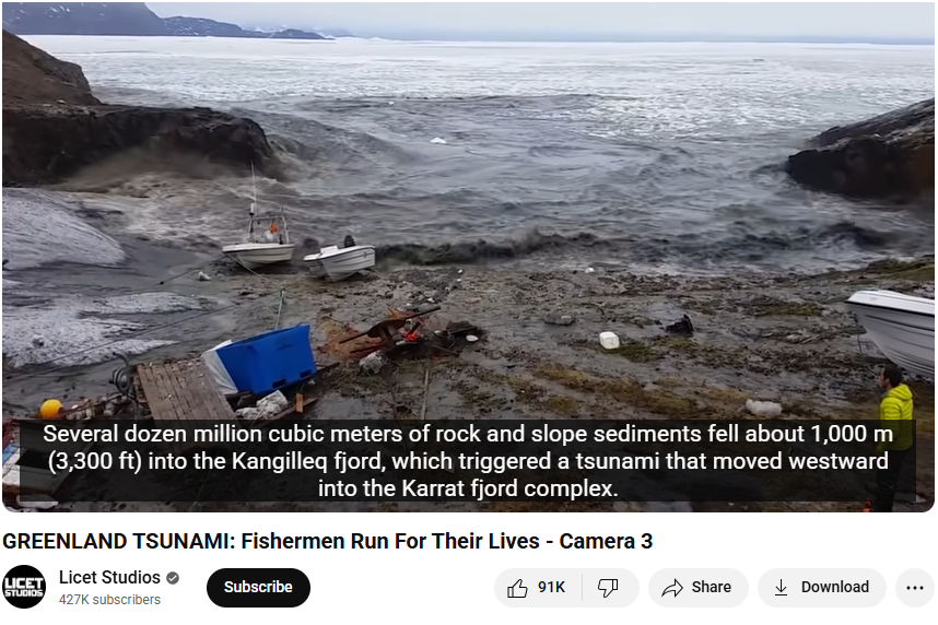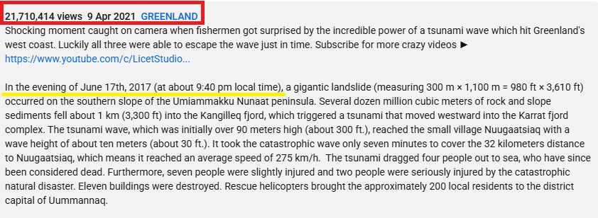 پھر ہم نے مذکورہ کیورڈ کو یوٹیوب پر سرچ کیا۔ اس دوران سونامی کی یہ ویڈیو لیسٹ اسٹوڈیوز نامی یوٹیوب چینل پر 9 اپریل 2021 کو اپلوڈ شدہ موصول ہوئی۔ جس کے ساتھ فراہم کردہ معلومات کے مطابق یہ منظر گرین لینڈ کے مغربی ساحل سے ٹکرانے والی سونامی لہر کا ہے، جس میں تین ماہی گیر اپنی جان بچانے میں کامیاب رہے۔ جبکہ ویڈیو کے ڈسکرپشن میں اسے 17 جون 2017 کا بتایا گیا ہے۔
