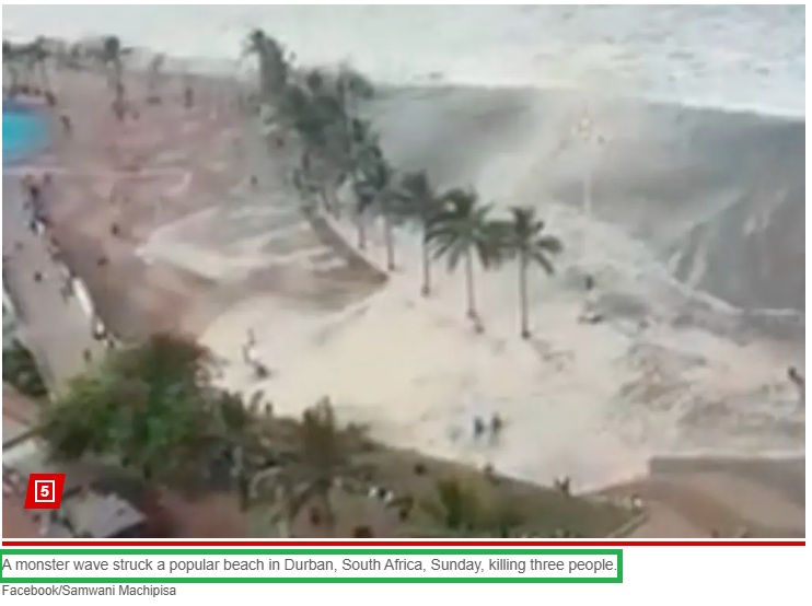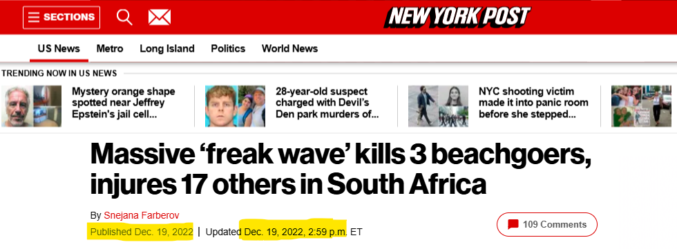 ویڈیو کے دوسرے حصے کے ایک فریم کو گوگل لینس کی مدد سے تلاش کیا۔ جہاں ہمیں 19 دسمبر 2022 کو شائع ہونے والی نیو یارک پوسٹ کی ایک رپورٹ ملی۔ جس میں وائرل ویڈیو کے چند فریم بھی موجود تھے۔تصویر کے ساتھ کیپشن میں اس منظر کو جنوبی افریقہ کے شہر ڈربن کے ایک ساحل سے سونامی لہر ٹکرانے کا بتایا گیا ہے۔ اس حادثے میں 3 افراد ہلاک اور ایک درجن سے زائد زخمی ہوئے تھے۔