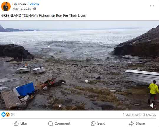 روس میں زلزلے کے بعد آئی سونامی کا بتاکر شیئر کی گئی ویڈیو کے پہلے حصے کے ایک فریم کو ہم نے گوگل لینس کی مدد سے تلاش کیا۔ اس دوران ہمیں یہی ویڈیو 16 مئی 2024 کو فک شُن نامی فیس بک پر شیئرشدہ موصول ہوئی۔ جس میں اس ویڈیو کو گرین لینڈ کا بتایا گیا ہے۔