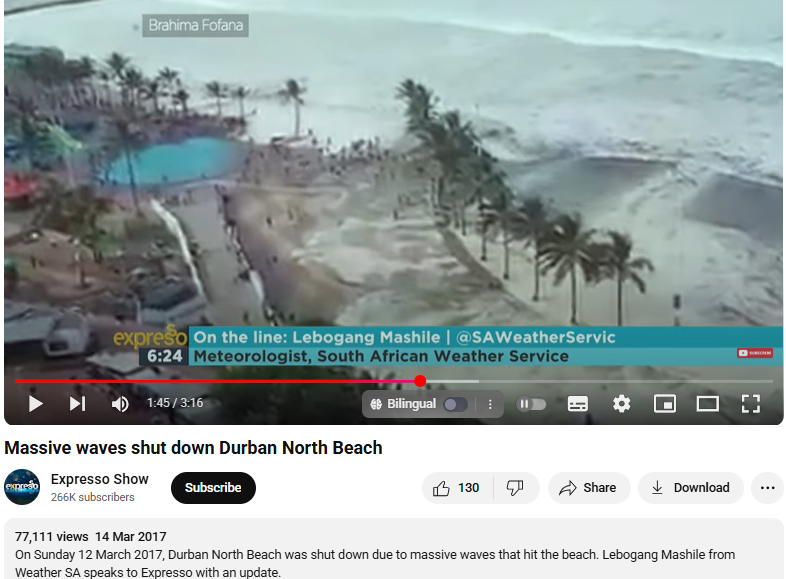 مزید تلاش کرنے پر ہمیں ایکسپریسو شو نامی یوٹیوب چینل پر 14 مارچ 2017 کو شائع ہونے والی ایک ویڈیو رپورٹ موصول ہوئی۔ جس کے ایک منٹ 45 سیکنڈ پر ہوبہو ویڈیو دیکھی جا سکتی ہے۔ اس رپورٹ میں بھی ویڈیو کو جنوبی افریقہ کے شمالی ڈربن میں 12 مارچ 2017 کو آنے والے سونامی کا بتایا گیا ہے۔