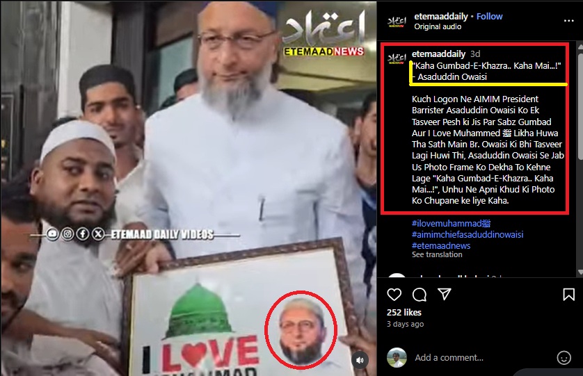 اس ویڈیو کو حیدرآباد کی معروف نیوز پیپر روزنامہ اعتماد نے بھی اپنے آفیشل انسٹاگرام پیج پر 3 اکتوبر کو شیئر کیا تھا۔ جس کے ساتھ فراہم کردہ معلومات کے مطابق کچھ افراد نے اے آئی ایم آئی ایم کے صدر اسد الدین اویسی کو ایک تصویر پیش کی جس میں سبز گنبدِ خضرا اور “آئی لو محمدؐ” لکھا ہوا تھا، اور ساتھ میں اویسی کی تصویر بھی لگی ہوئی تھی، جسے دیکھ کر اویسی نے کہا “کہاں گنبدِ خضرا، کہاں میں!” اور حامیوں سے اپنی تصویر چھپانے کو کہا۔ اس حوالے سے دیگر میڈیا رپورٹ یہاں دیکھیں۔