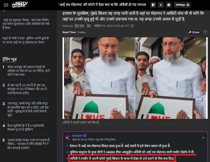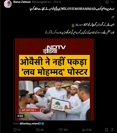 سوشل میڈیا پر ان دنوں پاکستانی صارفین این ڈی ٹی وی کا ایک کلپ شیئر کررہے ہیں، جس میں دعویٰ کیا جا رہا ہے کہ آل انڈیا مجلس اتحاد المسلمین کے سربراہ اسد الدین اویسی کو جب گنبد خضرا اور آئی لو محمدؐ لکھا ہوا ایک فریم پیش کیا گیا تو انہوں نے وہ فریم لینے سے انکار کر دیا اور یہ کہہ کر واپس کر دیا کہ “مجھے گنہگار مت بناؤ”۔ یہ ویڈیو مختلف پلیٹ فارمز پر اس تاثر کے ساتھ شیئر کی جا رہی ہے کہ اویسی نے نبی کریمؐ سے محبت کے اظہار سے گریز کیا۔