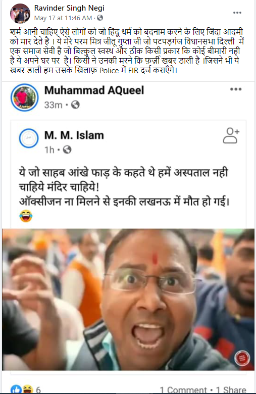 یہ میرے خاص دوست جیتو گپتا جی ہیں، جو دہلی کے پٹپڑ گنج اسمبلی حلقہ کے ایک سماجی کارکن ہیں۔ وہ بالکل صحت یاب اور صحیح سالم دنیا میں موجود ہیں۔ انہیں کسی بھی طرح کی کوئی بیماری نہیں ہے، یہ اپنے گھر پر ہیں۔ کسی نے ان کے مرنے کی فرضی خبر شیئر کی ہے۔ جس نے بھی یہ خبر شیئر کی ہے ہم ان کے خلاف پولس میں ایف آئی آر درج کروائیں گے۔