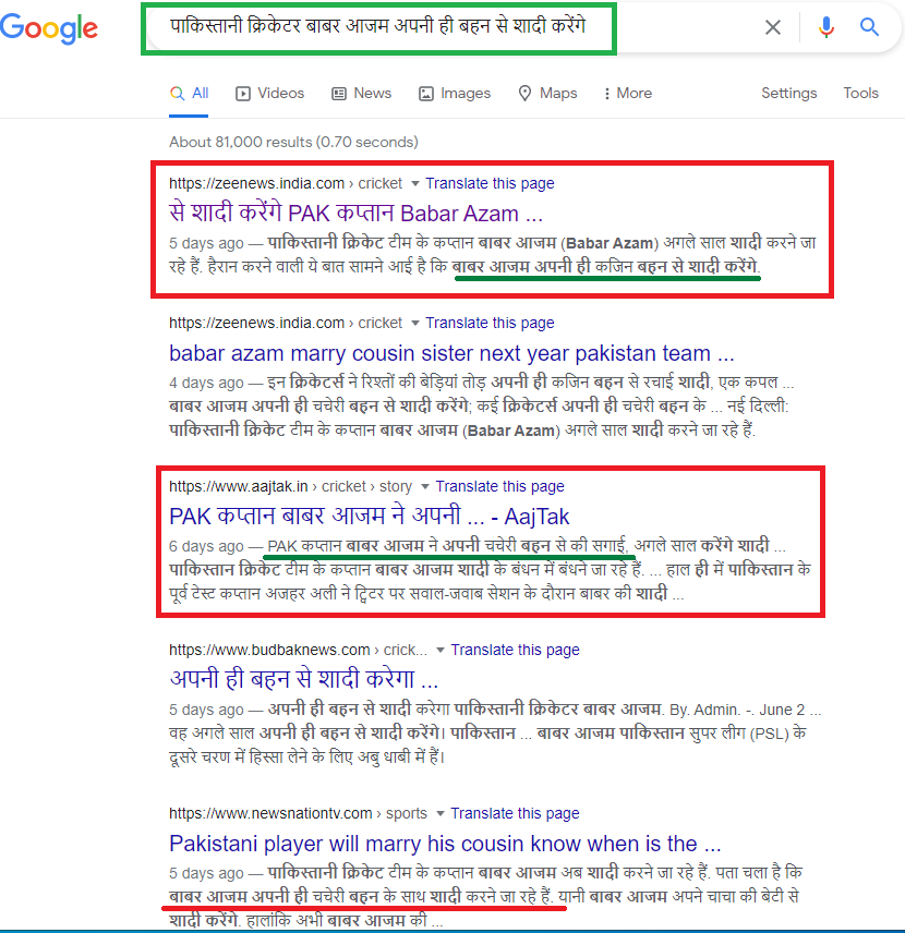 پاکستانی کرکٹر بابر اعظم کی شادی کے حوالے سے ہم نے اپنی ابتدائی تحقیقات شروع کی۔ سب سے پہلے ہم نے ہندی زبان میں کچھ کیورڈ سرچ کیا۔ اس دوران ہمیں اس حوالے سے کئی خبریں ملیں۔