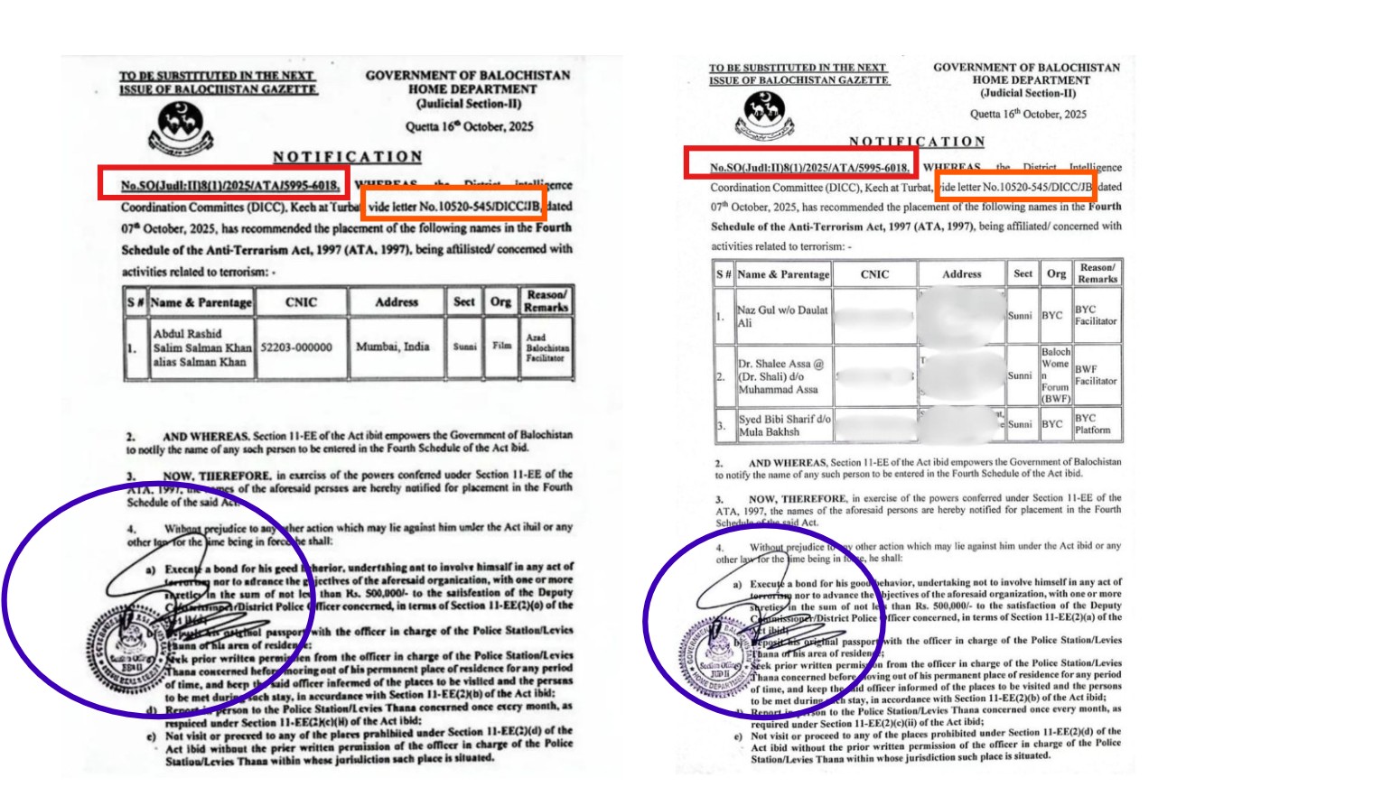 وائرل خط کو گوگل ریورس امیج سرچ کرنے پر ہمیں بلوچ ویمن فورم کی جانب سے 21 اکتوبر 2025 کو کیا گیا ایک ایکس پوسٹ ملا، جس میں اس سے ملتی جلتی ایک تصویر تھی۔ اس میں چوتھی شیڈول میں تین اراکین کو شامل کرنے کے بارے میں معلومات دی گئی تھیں۔ وائرل تصویر کا اس نوٹیفکیشن سے موازنہ کرنے پر ہمیں معلوم ہوا کہ وائرل دستاویز میں اسی نوٹیفکیشن جیسی معلومات تھیں۔ مثلاً سیریل نمبر، پہلے پیراگراف میں درج حروف کی تعداد، اجرا کی تاریخ، اسٹامپ/دستخط کی پوزیشن جس سے پتا چلتا ہے کہ غالباً یہی وہ دستاویز تھی، جسے سلمان خان کو نشانہ بنانے کے لئے جان بوجھ کر تبدیل کیا گیا تھا۔