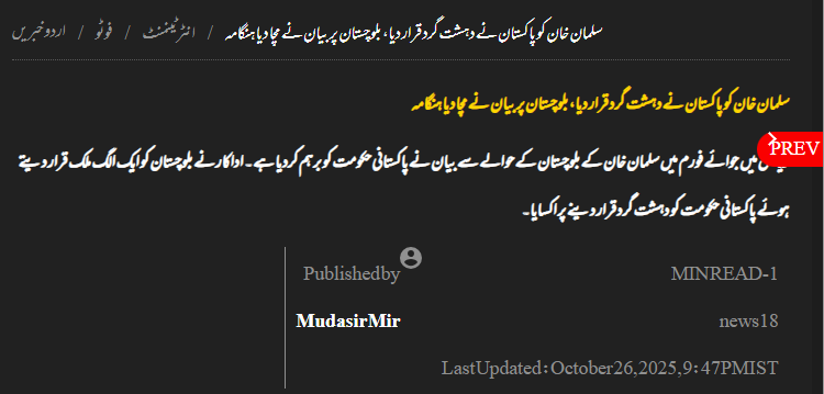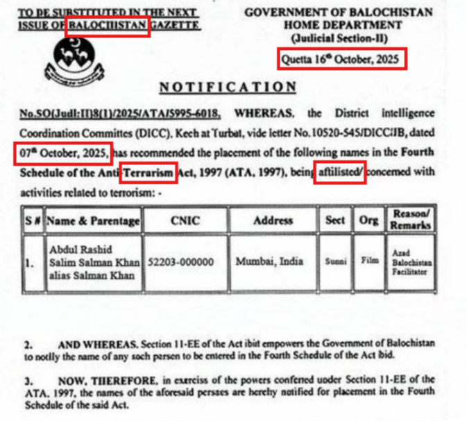 متعدد سوشل میڈیا صارفین اور نیوز ویب سائٹس نے دعویٰ کیا کہ اداکار سلمان خان کو پاکستان نے دہشت گرد قرار دے دیا ہے۔ دعویٰ یہ ہے کہ پاکستانی حکومت نے ان کے خلاف یہ کاروائی اس وقت کی جب سلمان خان نے ایک تقریب کے دوران بلوچستان کو پاکستان سے الگ کرنے کا ذکر کیا۔ اس پوسٹ میں محکمہ داخلہ بلوچستان کی جانب سے ایک مبینہ نوٹیفکیشن لیٹر بھی شامل تھا جس میں سلمان خان کا نام اور پتہ بھی موجود تھا۔