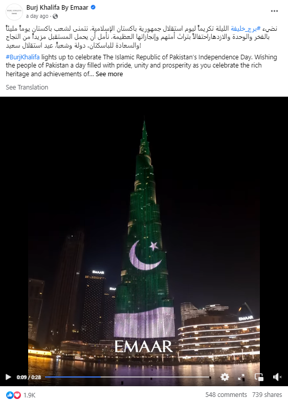 برج خلیفہ پر پاکستانی پرچم کی اسکریننگ کے حوالے سے کئے گئے دعوے کی سچائی جاننے کے لئے ہم نے سب سے پہلے برج خلیفہ کے آفیشل سوشل میڈیا کو کھنگالا۔ جہاں ہمیں برج خلیفہ بائی عمار کے آفیشل فیس بک پیج پر 14 اگست کو شیئر شدہ ویڈیو ملی۔ جس میں اسلامی جمہوریہ پاکستان کے یوم آزاد کے اعزاز میں روشن کئے گئے برج خلیفہ کو دیکھا جا سکتا ہے۔ اس کے علاوہ پاکستانی قوم کو مبارکباد بھی پیش کی گئی ہے۔