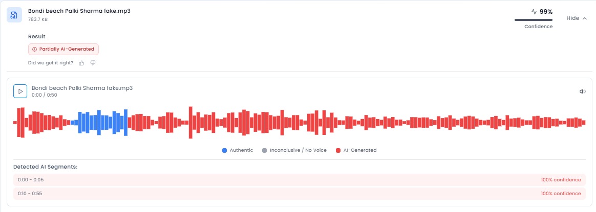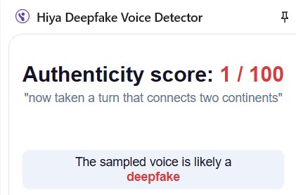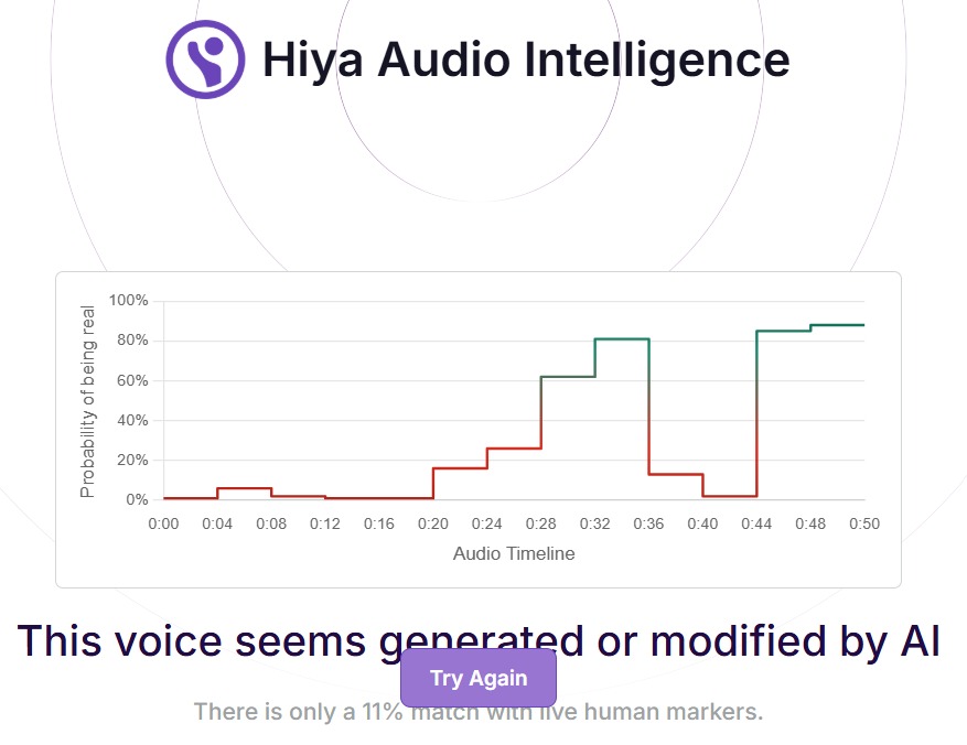 اوریجین اے آئی، جو کہ ایک سوئس ڈیپ ٹیک کمپنی ہے جس میں ایک جدید آڈیو ڈیپ فیک کا پتہ لگانے والا انجن ہے، نے اپنے تجزئے میں آڈیو ٹریک کو 99 فیصد اے آئی سے تیار کردہ بتایا۔ ہی یا اے آئی آڈیو کلاسیفائر نے 20 سے 30 سیکنڈ کے بیچ موجود آڈیو کو اے آئی جنریٹیڈ بتایا جبکہ بقیہ کو اصل بتایا ہے۔