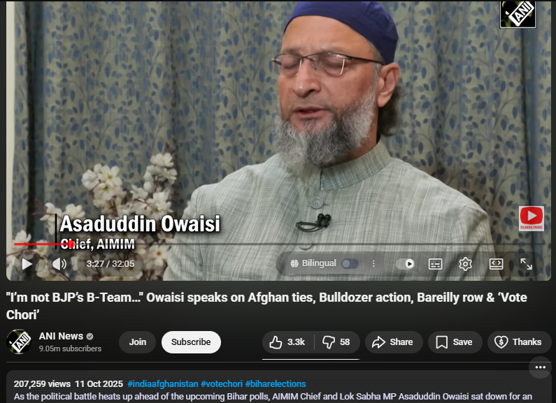 تحقیق کے دوران ہمیں 11 اکتوبر 2025 کو نیوز ایجنسی اے این آئی کے آفیشل یوٹیوب چینل پر اے آئی ایم آئی ایم کے صدر اسدالدین اویسی کا 32 منٹ اور 5 سیکنڈ طویل انٹرویو ملا۔ اس انٹرویو کو ہم نے بغور سنا، تاہم اس میں وہ کہیں بھی آسٹریلیا کے شہر سڈنی میں ہونے والے حملے سے متعلق گفتگو کرتے ہوئے سنائی نہیں دیے۔ البتہ اس دوران اسدالدین اویسی بی جے پی کی ’بی ٹیم‘، افغانستان سے تعلقات، بلڈوزر ایکشن، بریلی میں ’آئی لو محمد‘ تنازعہ اور ووٹ چوری جیسے موضوعات پر بات کرتے نظر آئے۔