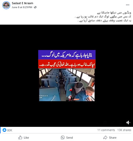 ویڈیو کے ساتھ ایک فیس بک صارف نے لکھا ہے “ویڈیو میں دیکھا جاسکتا ہے کہ بس میں بیٹھے لوگ ایک دم غائب ہو رہے ہیں۔ یہ ایک عجیب وقعہ پہلی دفعہ سامنے آرہا ہے”۔