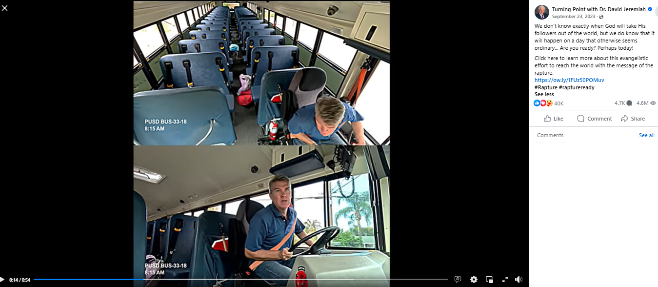 مزید سرچ کے دوران ہمیں یہی ویڈیو ڈیوڈ جرمیاہ کے آفیشل فیس بک پیج ٹرننگ پوائنٹ وتھ ڈاکٹر ڈیوڈ جرمیاہ پر موصول ہوئی۔ اس ویڈیو کو 23 ستمبر 2023 کو شیئر کیا گیا تھا اور ساتھ ہی اس کے ساتھ کیپشن میں لکھا ہے کہ “ہم نہیں جانتے کہ کب خدا اپنے پیروکاروں کو دنیا سے باہر لے جائے گا لیکن اتنا ضرور معلوم ہے کہ یہ ایک عام سے دکھنے والے ہی دن ہوگا۔ کہا آپ تیار ہیں؟؟؟؟ پرہیپس ٹوڈے”۔ حالانکہ اس میں ویڈیو کے اصل یا فرضی ہونے یا اس کے مقام کی کوئی معلومات نہیں دی گئی ہیں۔