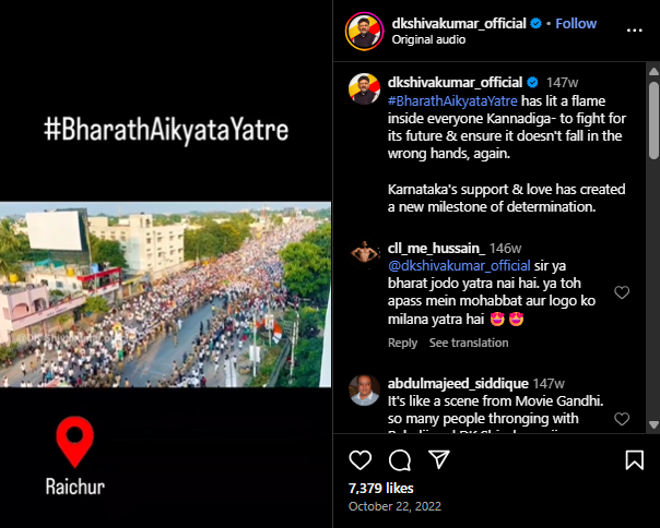 مزید سرچ کے دوران ہمیں 22 اکتوبر 2022 کو شیئر شدہ ہوبہو ویڈیو کرناٹک کے نائب وزیر اعلیٰ ڈی کے شیوکمار کے آفیشل انسٹاگرام پیج پر موصول ہوئی۔ جس کے مطابق اس ویڈیو کو کرناٹک کے رائچور میں بھارت جوڑو یاترا میں شامل ہونے والی بھیڑ کا بتایا گیا ہے۔ اس یاترا کے سلسلے میں تفصیلات کرناٹک کے نائب وزیر اعلیٰ ڈے کے شیو کمار نے اپنے ایکس ہینڈل پر 10 ستمبر 2022 کو دی تھی۔