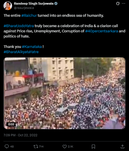 ہم نے سب سے پہلے وائرل ویڈیو کے چند فریموں کو گوگل لینس کی مدد سے تلاش کیا۔ اس دوران ہمیں مختلف اینگل سے فلمائی گئی وائرل ویڈیو سے ملتی جلتی کلپ انڈین نیشنل کانگریس کے جنرل سیکریٹری رندیپ سنگھ سرجے والا کے آفیشل ایکس ہینڈل پر 22 اکتوبر 2022 کو شیئر شدہ موصول ہوا۔ جس میں اس ویڈیو کو رائچور میں اختتام پذیر ہوئی بھارت جوڑو یاترا کا بتایا گیا ہے۔