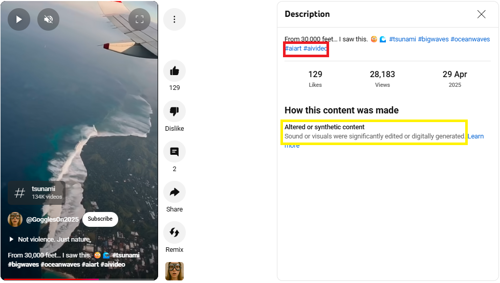 ویڈیو کی حقیقت جاننے کے لئے ہم نے سب سے پہلے ویڈیو کے کیفریم کو ریورس امیج سرچ کی مدد سے تلاش کیا۔ اس دوران ہمیں گوگلز آن نامی یوٹیوب چینل پر ہوبہو ویڈیو 29 اپریل 2025 کو اپلوڈ شدہ موصول ہوئی۔ اس ویڈیو کے ساتھ کیپشن میں لکھا ہے “30000 فٹ سے، میں نے یہ دیکھا”۔