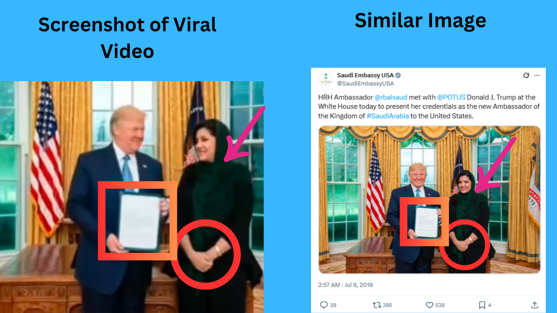 پھر ہم نے وائرل ویڈیو کے پہلے فریم کو گوگل لینس پر سرچ کیا۔ اس دوران ہمیں 9 جولائی 2019 کو شیئر شدہ ہوبہو لباس میں ملبوث امریکہ میں موجود سعودی سفیر ریما بنت بندر بن سعود اورامریکی ٹرمپ والی تصویر سعودی ایمبیسی یو ایس اے، سعودی وزیر خارجہ اور ریما کے آفیشل ایکس ہینڈل پر موصول ہوئی۔ جس سے معلوم ہوتا ہے کہ اسی تصویر کا استعمال کرکے اے آئی ٹول کے ذریعے ویڈیو بناکر شیئر کی جا رہی ہے۔