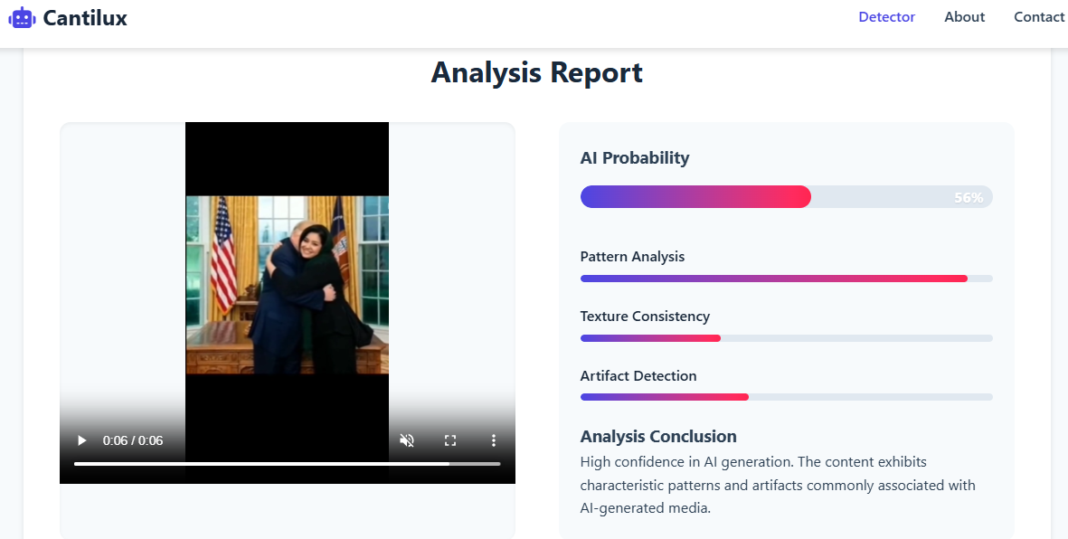 پھر ہم نے وائرل کلپ کو اے آئی کا پتا لگانے والے ٹول ‘کینٹی لکس’ کی مدد لی۔ جس میں اس ویڈیو میں 56 فیصد اے آئی مواد ہونے کا امکان ظاہر کیا گیا ہے۔