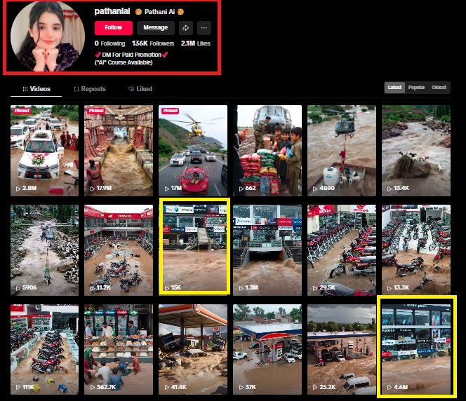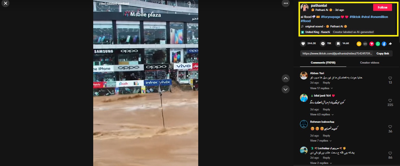 پھر ہم نے ویڈیو کے ایک فریم کے ساتھ “فَلڈ اے آئی پاکستان” کیورڈ تلاش کیا۔ اس دوران ہمیں پٹھانی اے آئی نامی ٹک ٹاک ہینڈل کا لنک موصول ہوا۔ اس ہینڈل تک ہم نے کچھ مخصوص ٹول کی مدد سے رسائی کی۔ جہاں ہمیں تین روز قبل شیئر کردہ یہی ویڈیو موصول ہوئی۔ جس کے کیپشن میں واضح طور پر لکھا ہے کہ اس ویڈیو کو اے آئی کی مدد سے تیار کیا گیا ہے۔