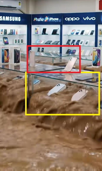 ایسے ہی ویڈیو کے تیسرے فریم میں پانی اچانک تیز رفتار سے کارنر سے بہہ کر نکل جاتا ہے اور چیزیں اپنی جگہ سے ہلتی تک نہیں ہیں۔ اسی طرح چوتھے اور پانچویں فریموں میں بھی کئی ایسے شبہات نظر آئے، جس سے ہمیں اس ویڈیو کے اے آئی سے تیار کردہ ہونے کا شبہ ظاہر ہوا۔