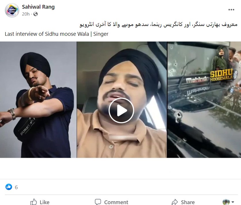دراصل پنجاب کے مانسا میں پنجابی گلوکار سدھو موسے والا کو اتوار کے دن گولی مار کر ہلاک کر دیا گیا۔ میڈیا رپورٹس کے مطابق سدھو کے قتل کی ذمہ داری گینگسٹر لارینس بشنوئی کے ساتھی گولڈی برار نے لی ہے۔ اب اسی کے پیش نظر پنجابی گلوکار سدھو موسے والا کا آخری انٹرویو بتا کر فیس بک اور یوٹیوب پر شیئر کیا جا رہا ہے۔