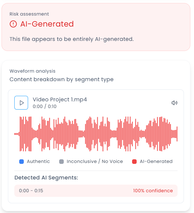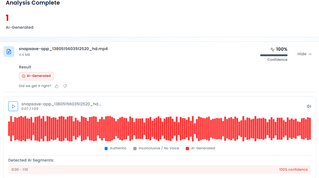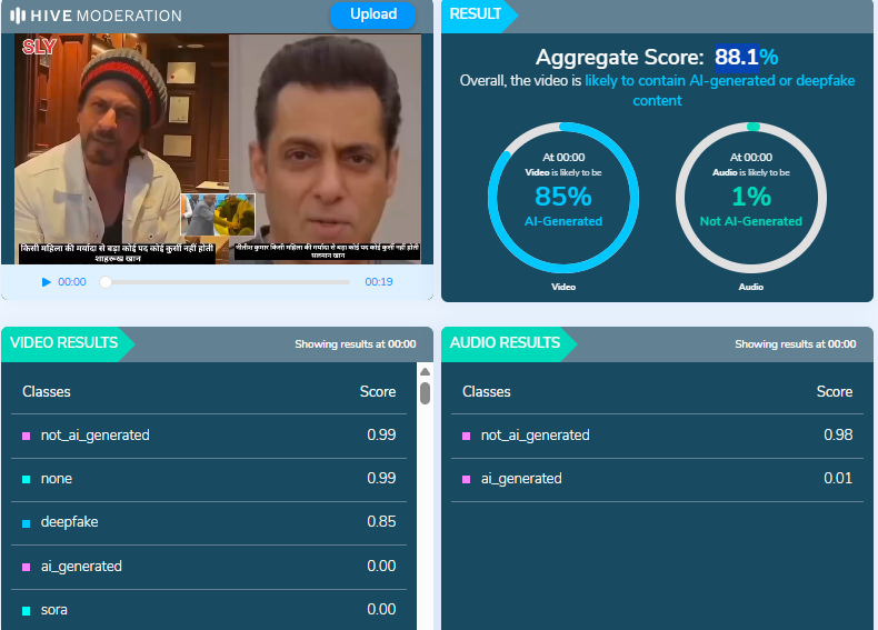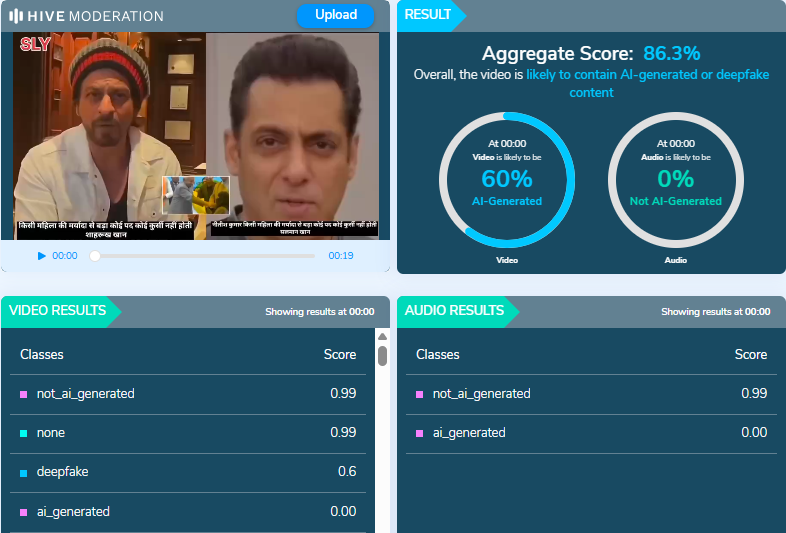 ہائیو ماڈریشن نے ویڈیو کے دو مختلف حصوں کا تجزیہ کیا، جس میں ایک حصے کے 86.3 فیصد اور دوسرے کے 88.1 فیصد تک اے آئی سے تیار یا ڈیپ فیک مواد ہونے کے امکانات ظاہر کئے۔