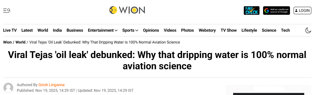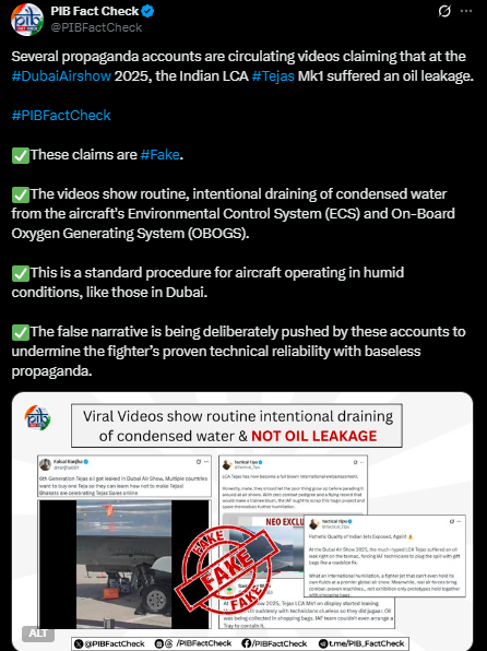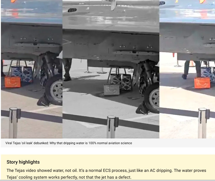 فیس بک اور ایکس (سابقہ ٹوئٹر) پر ایک ویڈیو بڑے پیمانے پر گردش کر رہی ہے جس میں تیجس طیارے کے نیچے سے تیل نما شئی ٹپکتا ہوا دکھائی دیتا ہے۔ متعدد صارفین نے اسے “تیل لیک” قرار دے کر طیارے کی کارکردگی پر سوالات اٹھائے۔ چونکہ یہ ویڈیو دبئی ایئر شو 2025 کے دوران بنائی گئی ہے، اس لئے بحث مزید بڑھ گئی ہے۔