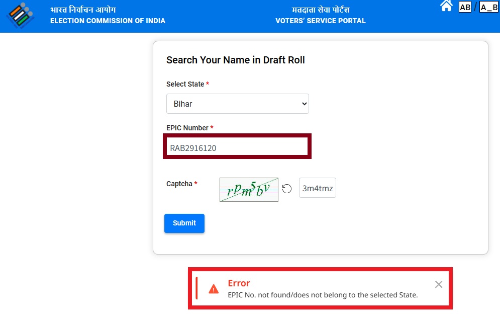 وائرل دعوے کی جانچ کے لئے ہم نے سب سے پہلے تیجسوی یادو کے پریس کانفرنس کے دوران بتائے گئے ای پی آئی سی نمبر (آر اے بی2916120) کو ڈرافٹ ووٹر لسٹ میں ڈال کر سرچ کیا۔ اس دوران ویب سائٹ نے اس نمبر سے متعلق کوئی ریکارڈ دستیاب نا ہونے کی بات کہی۔