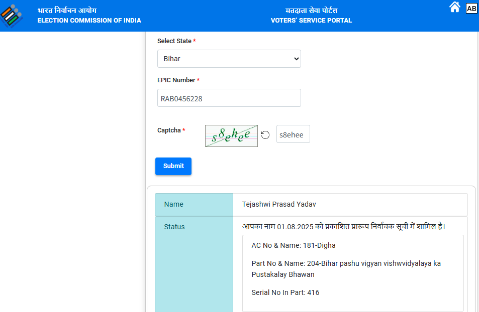 اس کی تصدیق کے لیے جب ہم نے الیکشن کمیشن کی ویب سائٹ پر 1 اگست کو جاری کردہ ڈرافٹ لسٹ کو چیک کیا تو ہم نے پایا کہ تیجسوی یادو کا نام سیریل نمبر 416 اور ای پی آئی سی نمبر آر اے بی0456228 کے ساتھ درج تھا۔