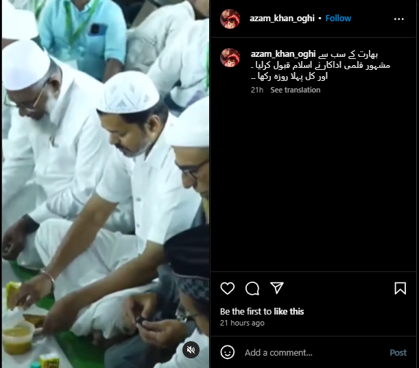 صارفین کا دعویٰ ہے کہ جنوبی بھارت کے معروف اداکار تھلاپتی وجے نے ماہ رمضان میں اسلام قبول کرنے کے بعد افطار کیا اور نماز بھی ادا کیا۔ ویڈی کے ساتھ ایک فیس بک صارف نے کیپشن میں لکھا ہے “بھارت کے سب سے مشہور فلمی اداکار نے اسلام قبول کرلیا اور کل پہلا روزہ رکھا”۔