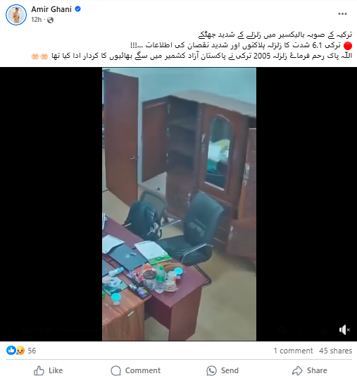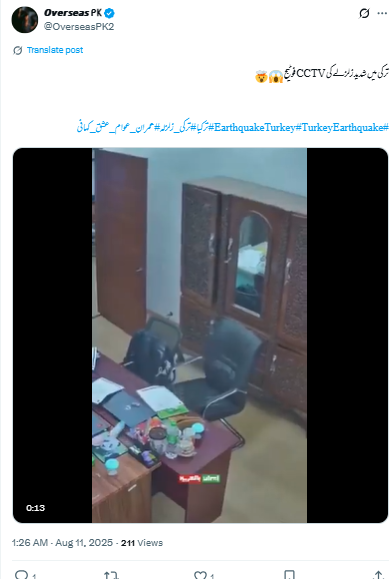 ویڈیو کے ساتھ ایک صارف نے لکھا ہے “10 گست 2025 کی شام تقریباً 7:53 بجے ترکیہ کے شمال مغربی صوبہ بالکسیر کے سندرگی ضلع میں 6.1 شدت کا زلزلہ آیا۔ جھٹکے استنبول، ازمیر سمیت کئی شہروں میں محسوس کئے گئے۔ ایک درجن عمارتیں گر پڑیں، کئی افراد ملبے تلے دب گئے، اور ایک مسجد کا مینار بھی تباہ ہوا۔ خوش قسمتی سے فوری طور پر جانی نقصان کی اطلاع نہیں ملی۔ ریلیف ٹیمیں امدادی سرگرمیوں میں مصروف ہیں۔ حکومت نے شہریوں کو نقصان زدہ عمارتوں میں داخل نہ ہونے کی ہدایت جاری کی ہے۔ دعاؤں میں یاد رکھیں”۔
