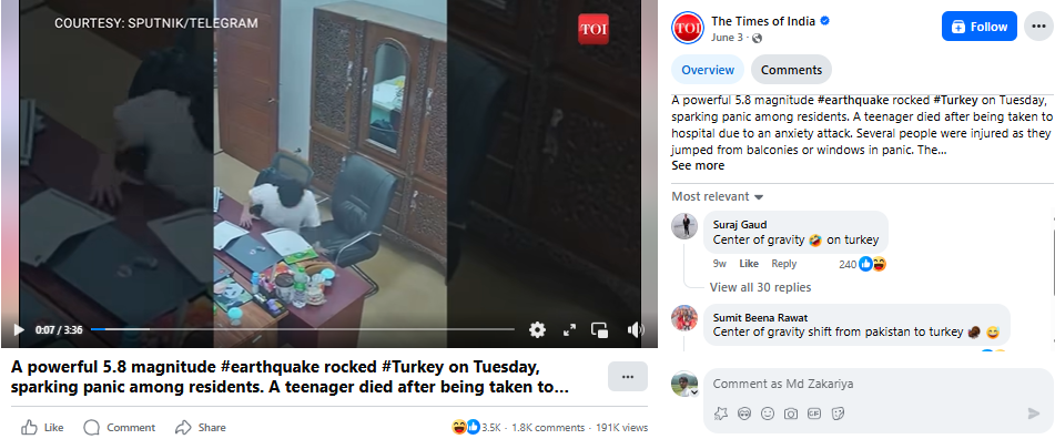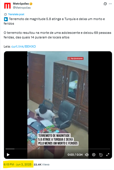 پھر ہم نے مذکورہ کیورڈ گوگل پر تلاش کیا۔ اس دوران ہمیں یہی ویڈیو پرتغالی نیوز ایجنسی کے آفیشل ایکس ہنڈل میٹرو پولس پر ملی۔ جس کے ساتھ فراہم کردہ معلومات کے مطابق ترکیہ میں 5.8 شدت کے زلزلے میں ایک شخص ہلاک اور69 زخمی ہوئے ہیں۔ اس ویڈیو کو ٹائمس آف انڈیا نے اپنے آفیشل فیس بک پیج پر 3 جون 2025 کو ترکیہ میں 5.8 شدت کے زلزلے کا بتاکر شیئر کیا ہے۔