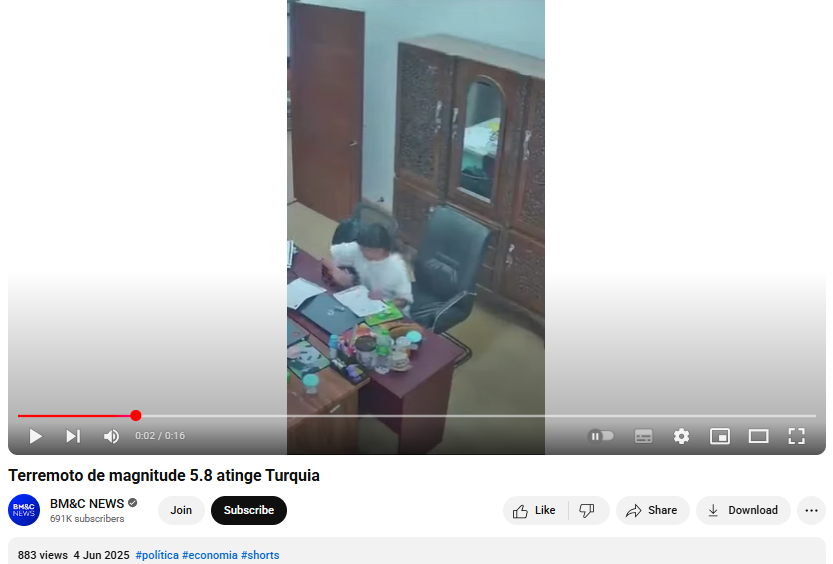 مزید سرچ کے دوران ہمیں یہی ویڈیو برازیلین ٹی وی چینل بی ایم اینڈ سی نیوز کے یوٹیوب چینل پر 4 جون 2025 کو اپلود شدہ موصول ہوئی۔ جس کے عنوان میں لکھا ہے “ترکی میں 5.8 شدت کا زلزلہ”۔