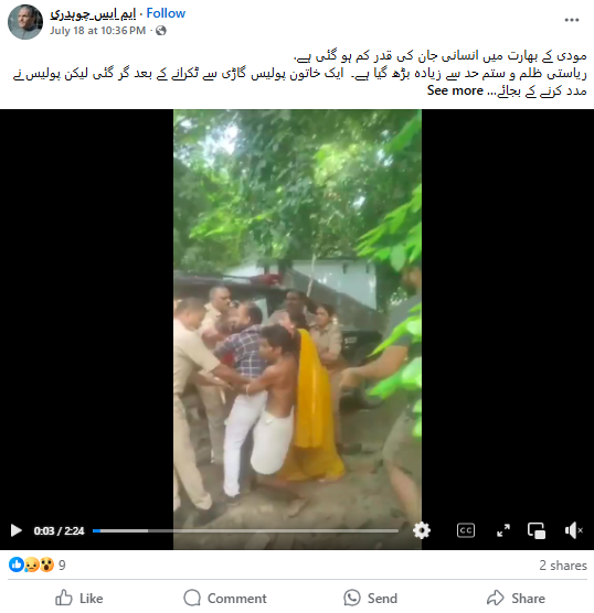 ایکس اور فیس بک پر 1 منٹ 44 سیکنڈ کی ایک ویڈیو اس دعوے کے ساتھ شیئر کی گئی کہ بھارت میں پولس کی گاڑی سے ایک خاتون ٹکر کھاکر گر گئی اور پولس اس کی مدد کرنے کے بجائے اس کے اہل خانہ کو گرفتار کر کے لے جا رہی ہے۔ ویڈیو میں پولس اہلکار کچھ مردوں کو جبراً گاڑی میں بٹھانے کی کوشش کرتی ہوئے دکھائی دے رہی ہے اور کچھ خواتین پولس سے بحث کرتی ہوئی اور انہیں روکتی ہوئی نظر آ رہی ہیں۔ ایک خاتون پولس کی گاڑی کے کنارے لیٹی ہوئی نظر آ رہی ہیں۔