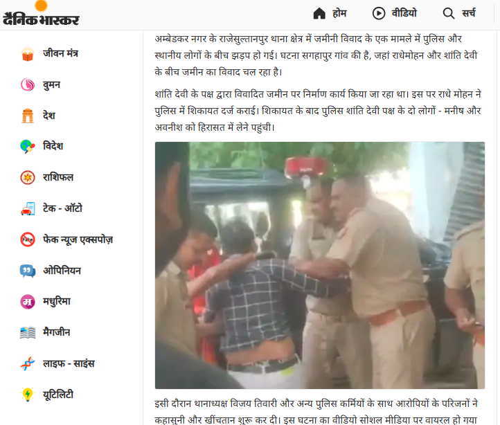 پولس کی گاڑی سے ٹکر کھاکر گری خاتون کے لواحقین کو گرفتار کئے جانے کا بتاکر شیئر کی گئی ویڈیو کی حقیقت جاننے کے لئے ہم نے سب سے پہلے ویڈیو کے کیفریم کو گوگل لینس پر سرچ کیا۔ اس دوران ہمیں دینک بھاسکر کی ویب سائٹ پر اسی ویڈیو کے ساتھ 18 جولائی کو شائع ایک خبر موصول ہوئی۔ اس رپورٹ کے مطابق یہ اترپردیش کے امبیڈکر نگر کے سگہاپور گاؤں کا معاملہ ہے۔ جہاں رادھے موہن و شانتی دیوی کے درمیان زمین تنازعہ چل رہا تھا۔ اسی سلسلے میں پولس ملزموں کو گرفتار کرنے پہنچی تھی۔ اسی دوران ملزم کے لواحقین نے پولس کے ساتھ مار پیٹ کی تھی۔